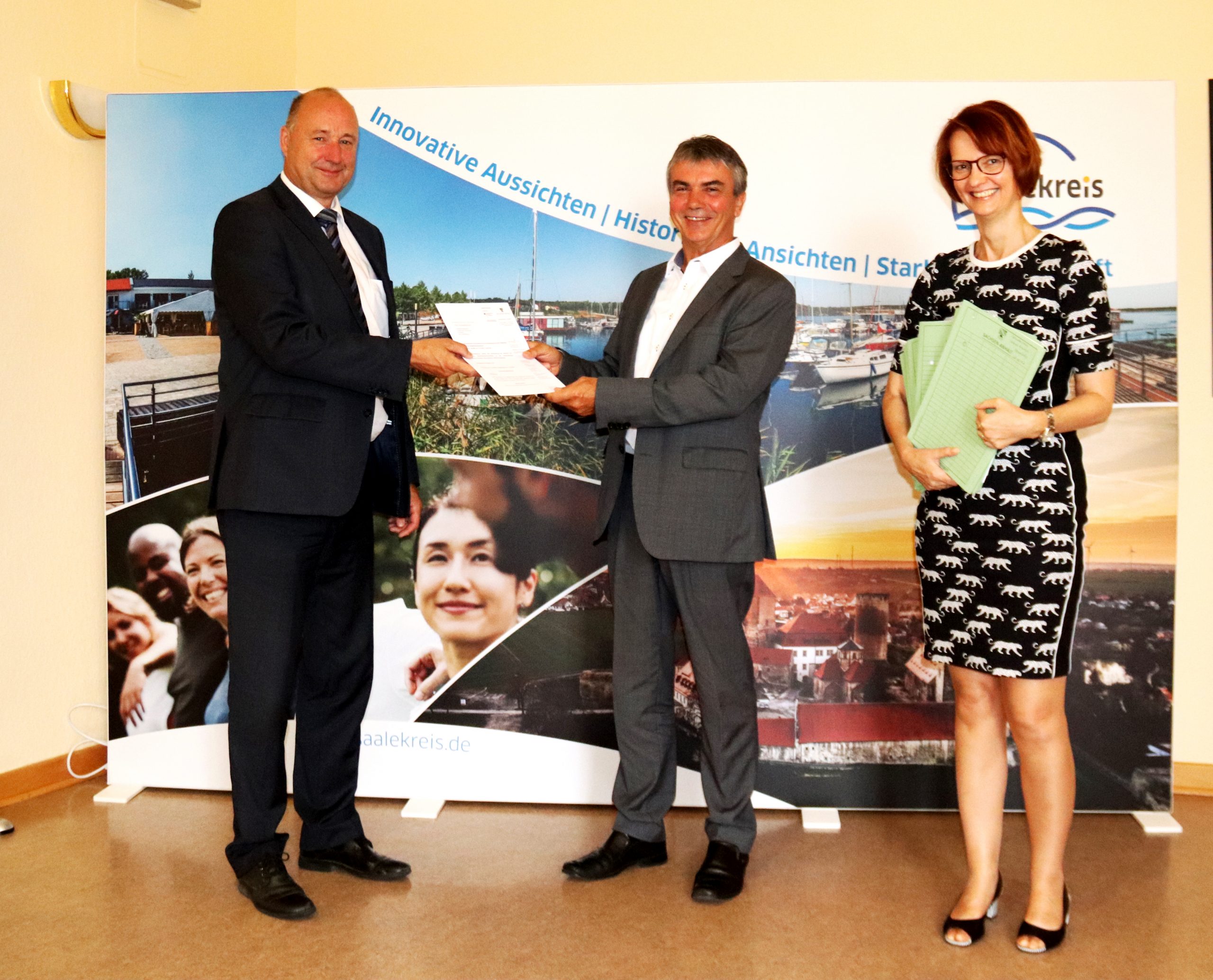 Foto: Landrat Hartmut Handschak (parteilos), Dr. Steffen Eichner, Vizepräsident des Landesverwaltungsamtes und Annett Hellwig, Dezernentin für Gesundheit, Soziales und Bildung bei der Übergabe der ersten Fördermittelbescheide (vlnr) @Landkreis Saalekreis